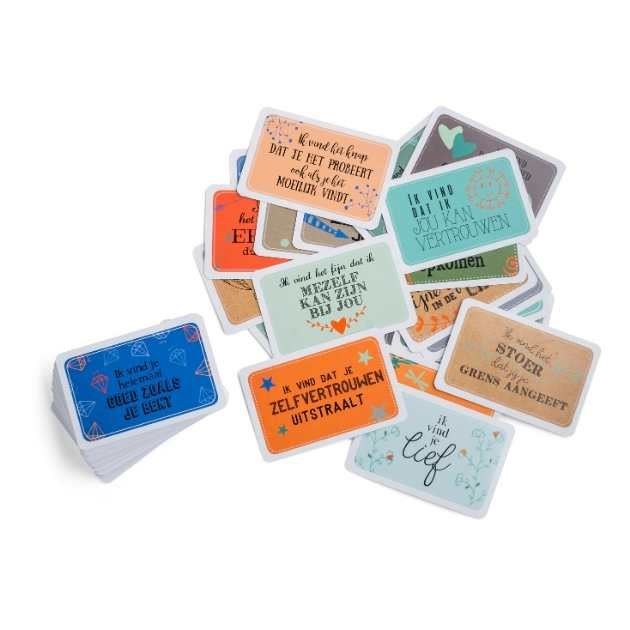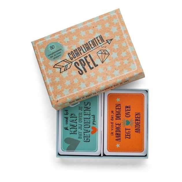Het Complimentenspel bevat 80 kaarten met stoere, speelse en unieke complimenten. Dit is een herziene versie met 20 andere kaarten als de vorige uitgave.