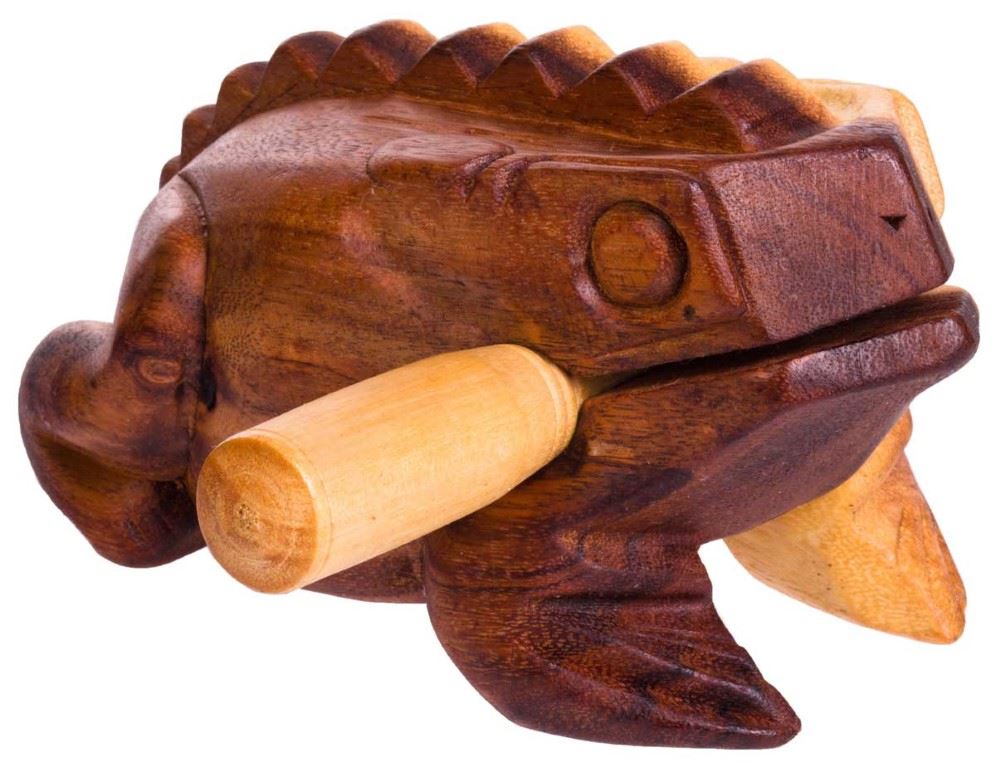 Natuurlijk kan deze houten kikker ook worden gebruikt als guiro en woodblock.