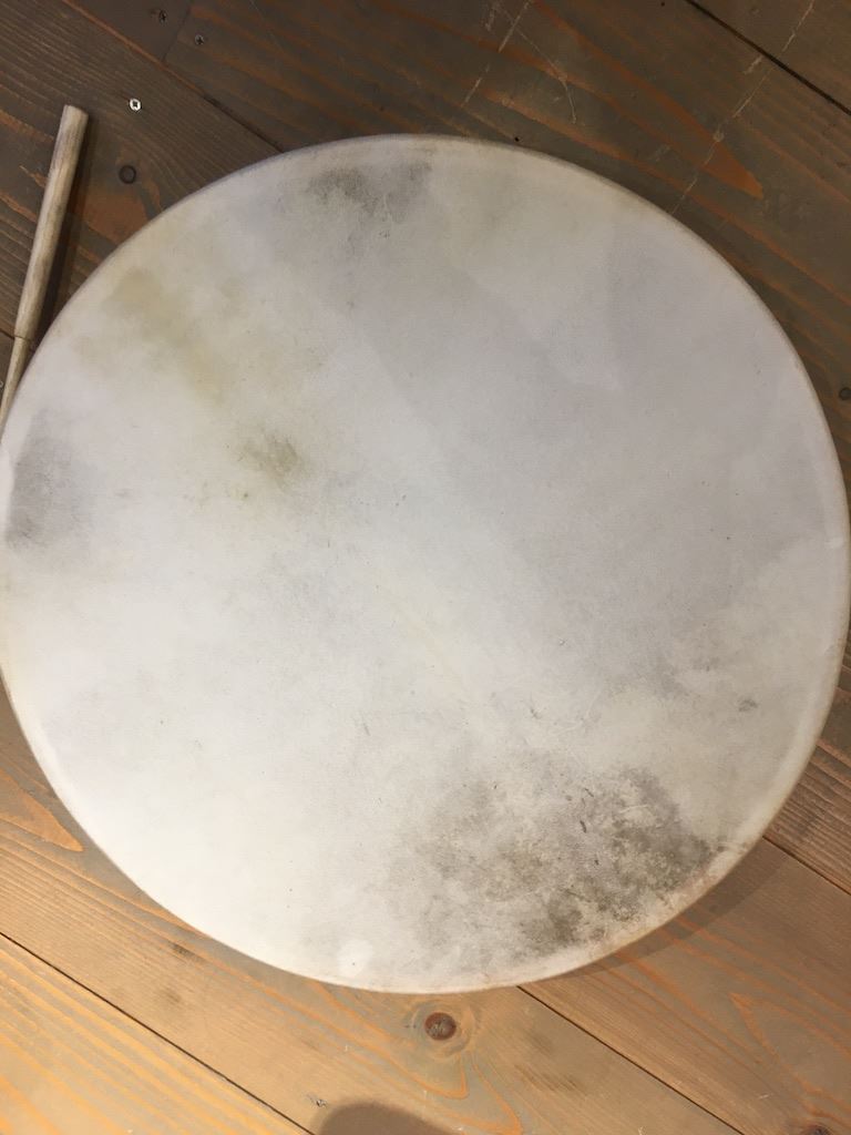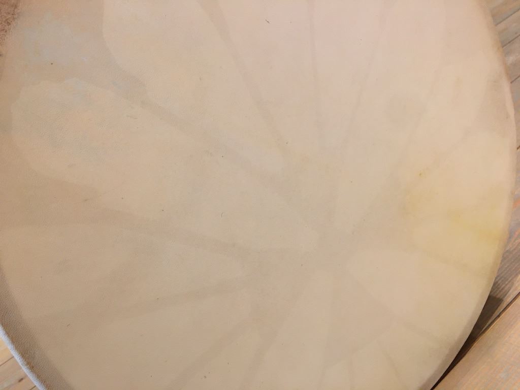 Het geitenvel met een diameter van ongeveer 56 cm is traditioneel gespannen over een houten frame.