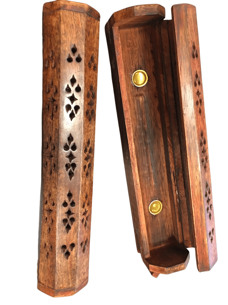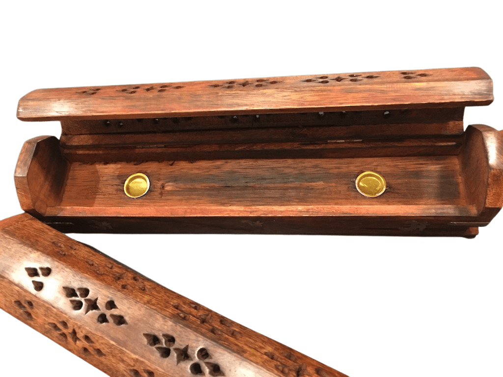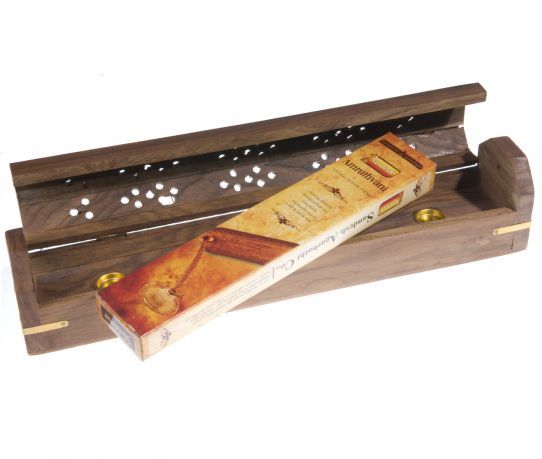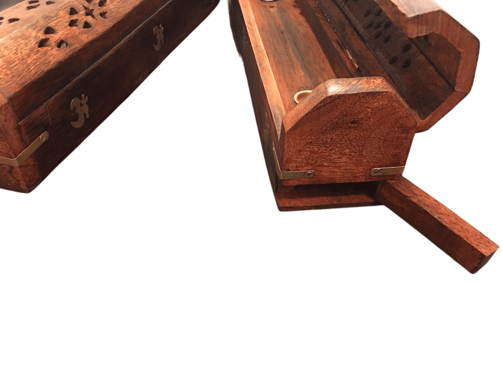 Houten wierook opbergdoos en brander tegelijkertijd. Geschikt voor wierookkegeltjes of voor wierookstokjes.