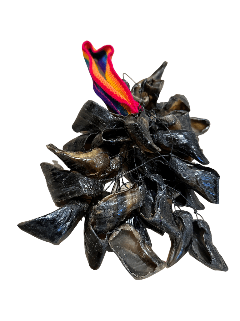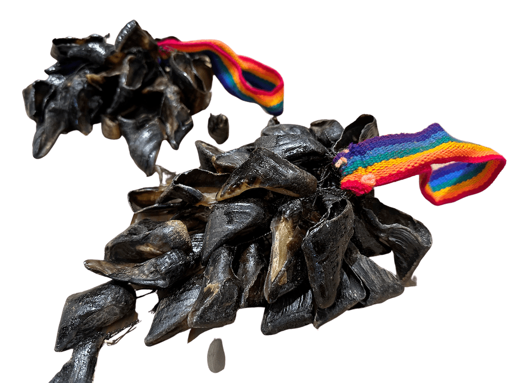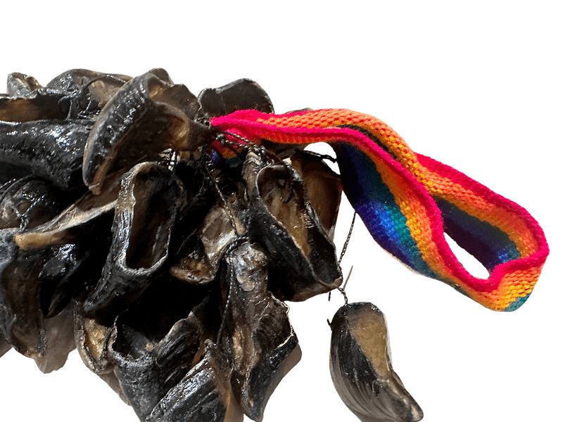 Geitennagels vastgeknoopt aan touwtjes en die met z'n alle vastgemaakt aan een geweven band.