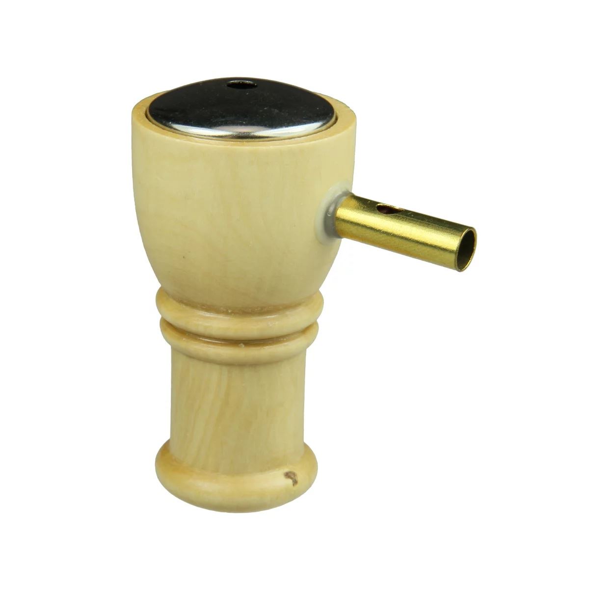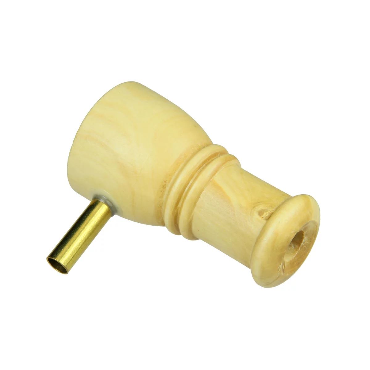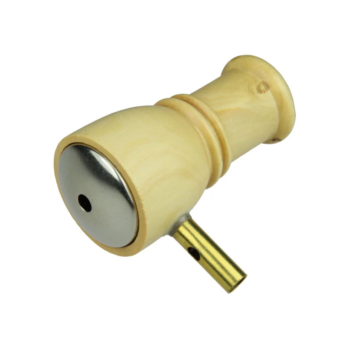 Het vogelfluitje is gemaakt van hout met een metalen deksel en metalen tuitje.