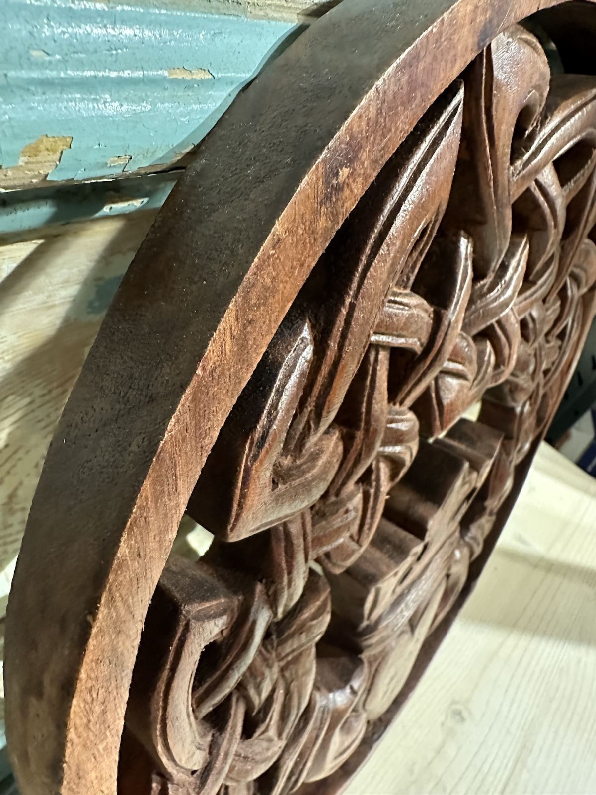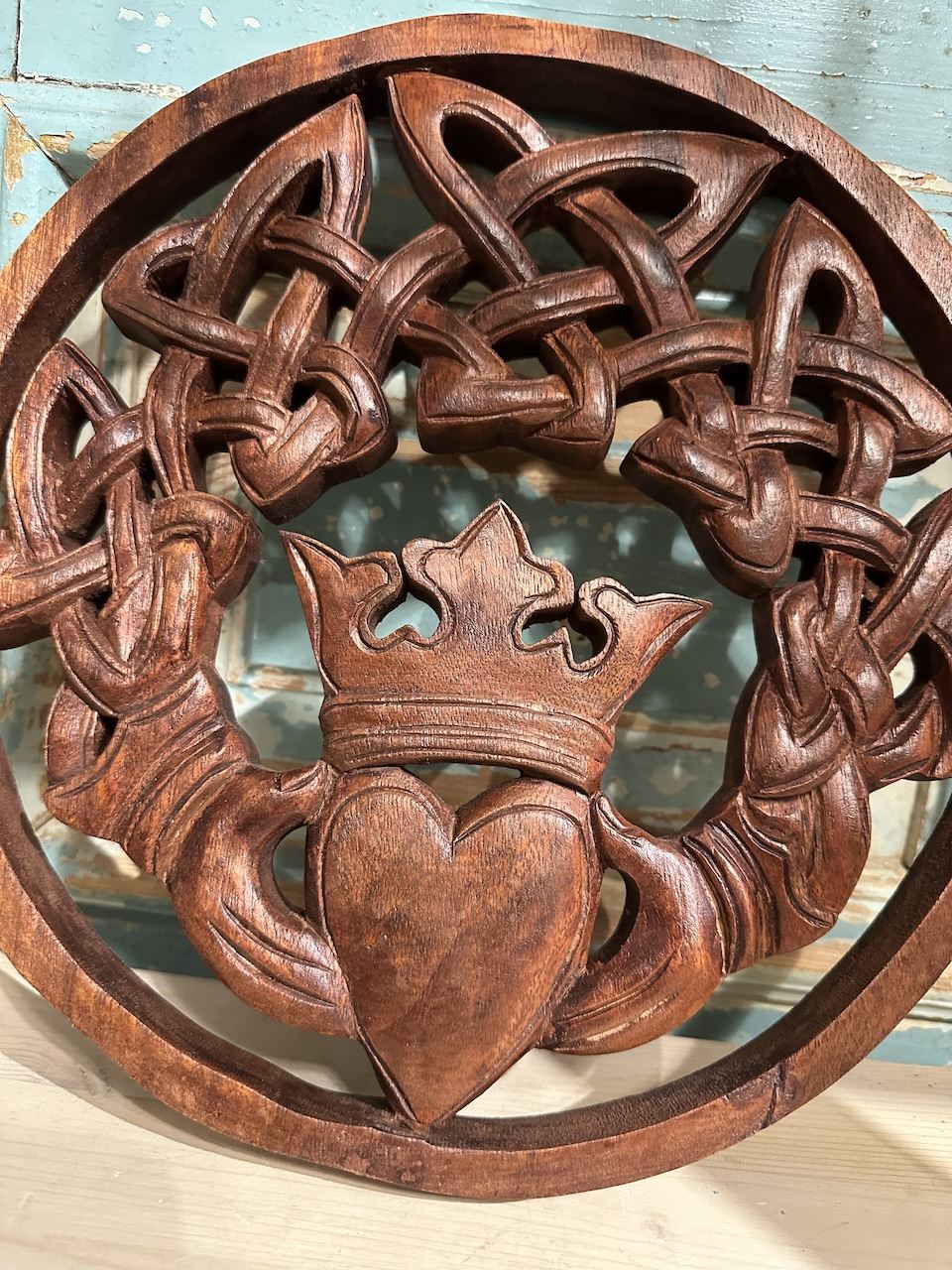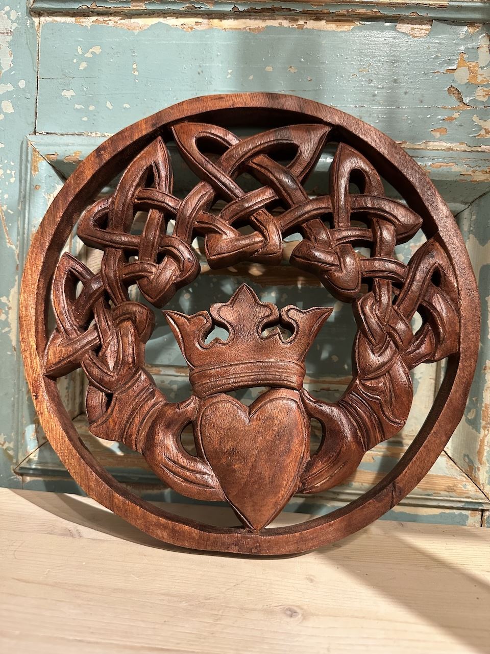 De Claddagh ring die wij aanbieden heeft de volgende afmetingen: diameter 30 cm en x 2 cm dik en is gesneden uit mahonie hout.