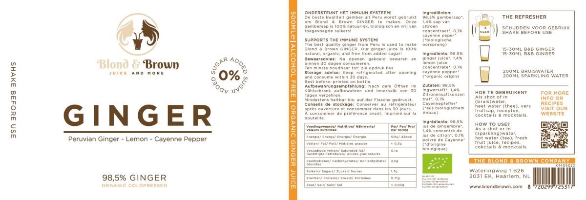 Deze Blond & Brown 500 ml biologische gembersap is ongeveer voor 20 porties.