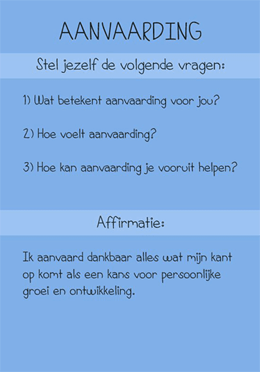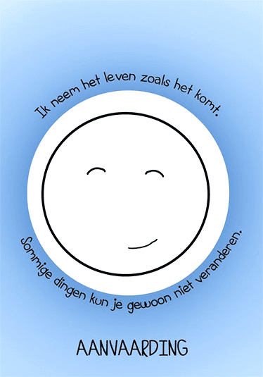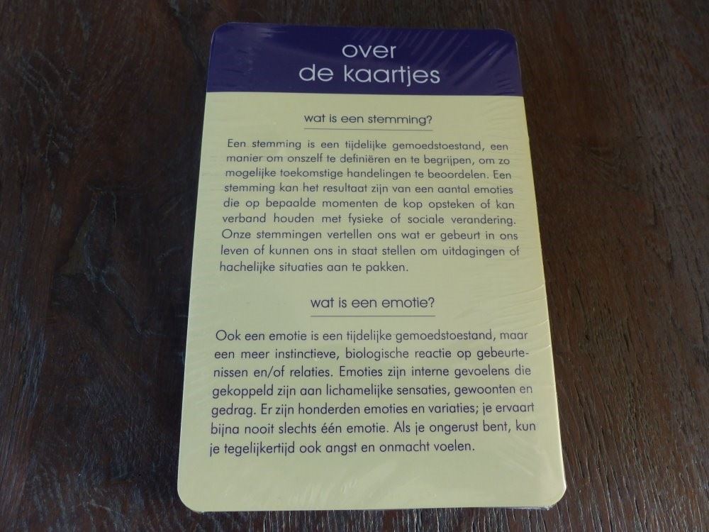 Op de voorkant staat de stemming, op de achterkant staan een aantal vragen die je zo eerlijk mogelijk moet beantwoorden. Op deze manier kun je vertrouwd raken met je stemmingen en emoties.