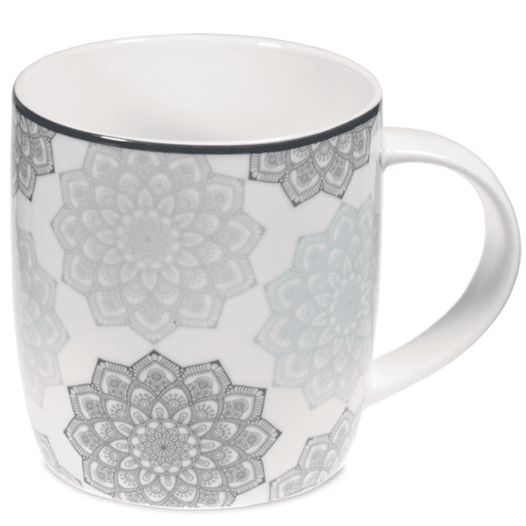 Deze theemok is voorzien van een mandala in de kleur grijs.